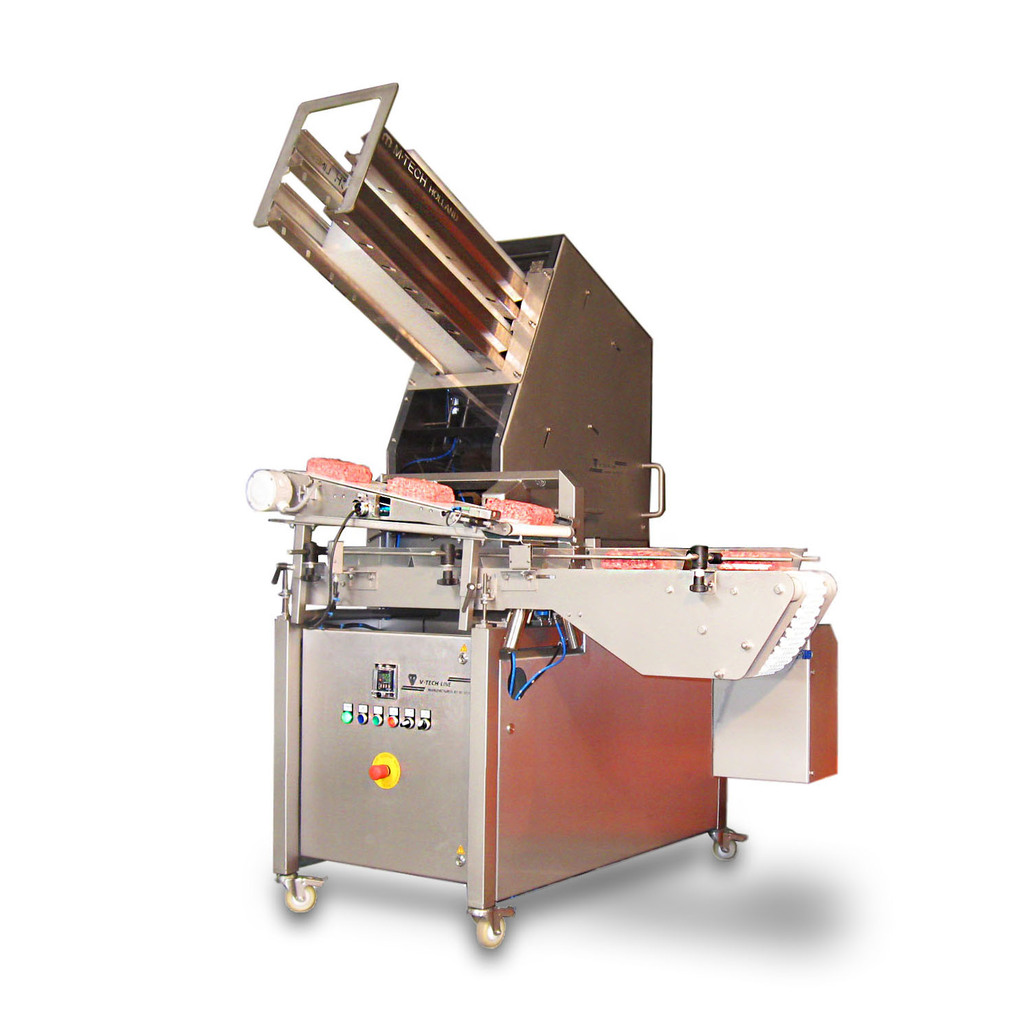 Zeer compacte automatische tray ontnester en belader combinatie. Automatisch ontnesten en beladen in één machine. Zeer compacte uitvoering. Direct achter portioneer machine of checkweger te plaatsen (evt. verrijdbaar)